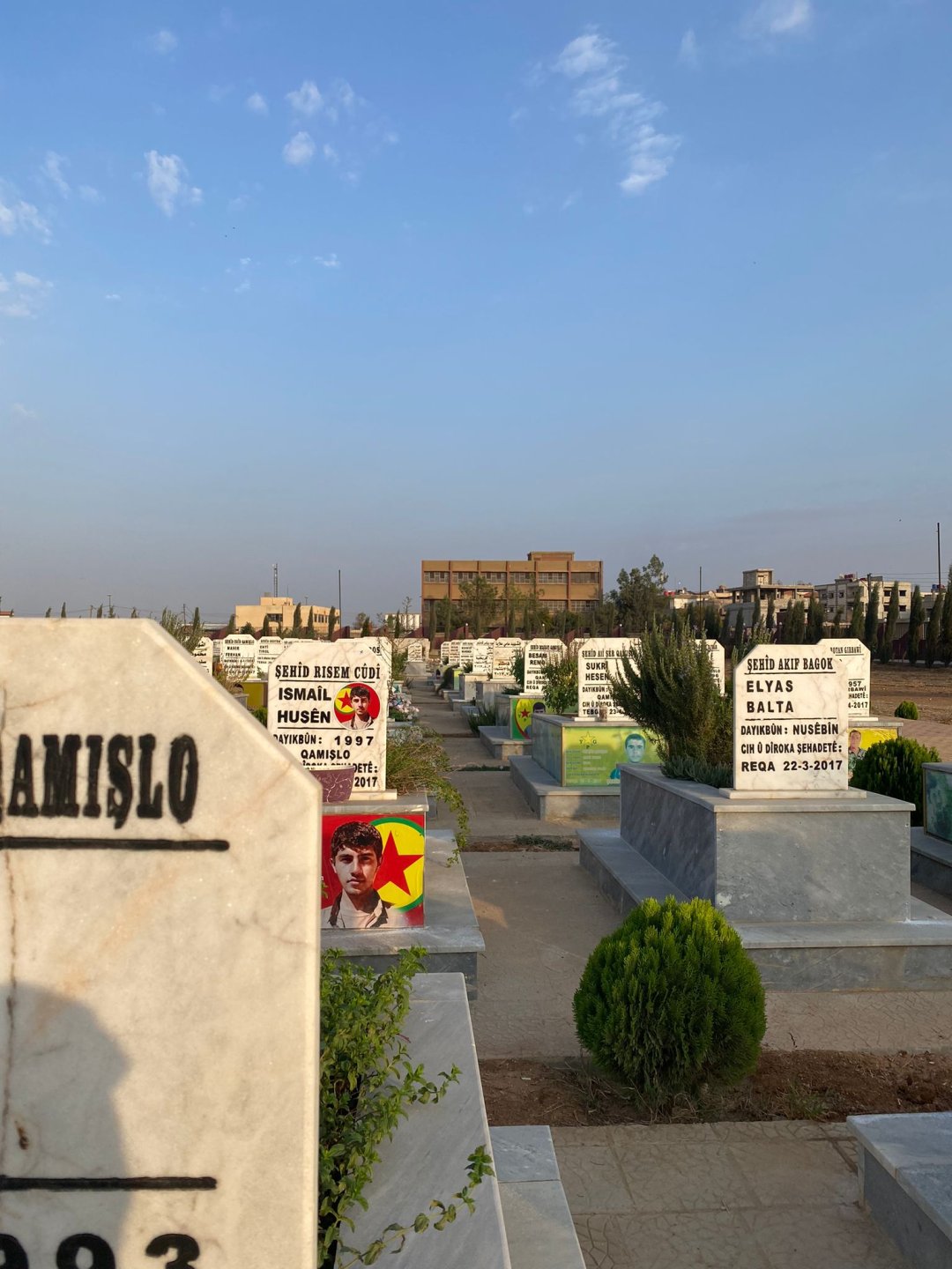 Wir besuchen im Schnellverfahren mit den anderen Kollegen aus dem Europaparlament NGOs, Kämpfende … Anwesend sein, Fotos, fertig. Ich mag das nicht. Fühle mich auch nicht sicher. Fühle mich nicht sicher auf dem Friedhofsgelände der Gefallenen gegen den IS. Wir kommen am Eingang des Friedhofs an: Kameras, Militär. Ich zu Alan: „Ich will das nicht. Da hängt Öcalan. Ich muss ihm nicht huldigen. Ich will mit den Menschen im Café sprechen, den Frauen. Brauche keinen Zirkus.“