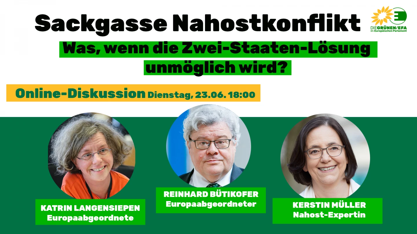 Bei all dem bleibt eine mögliche Zwei-Staaten-Lösung in weiter Ferne. Daher möchten wir Euch zum Webinar „Sackgasse Nahostkonflikt: Was, wenn die Zwei-Staaten-Lösung unmöglich wird?“ einladen. Gemeinsam mit Kerstin Müller, der früheren Fraktionsvorsitzenden der Grünen Bundestagsfraktion und Staatsministerin a.D. im Auswärtigen Amt, wollen wir dazu sprechen. Als Senior Associate Fellow für die DGAP veröffentlichte Kerstin Müller kürzlich einen Artikel zu diesem Thema, den ihr hier finden könnt.